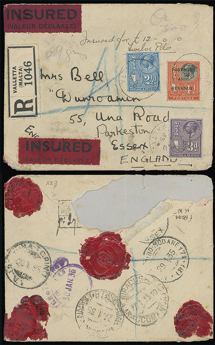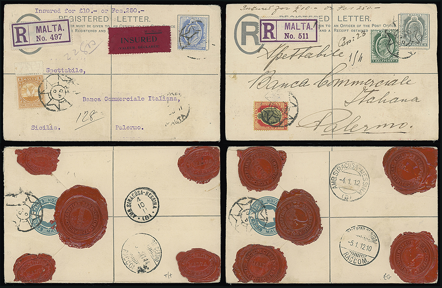 1362 c, entire, etc. imageMalta: Auxiliary Services: 1911 (Oct. 2), 1912 (Jan. 12) K.E.VII 2d. registration envelopes to Palermo each endorsed “Insured for £10” with black on red “INSURED” labels and franked 21/2d. and 41/2d. or 1/2d., 2d. and 41/2d., the former apparently miscalculated and 1/2d. underpaid, red wax seals and Syracuse transit datestamps on the reverse. (2 items) Photo. (Image1)