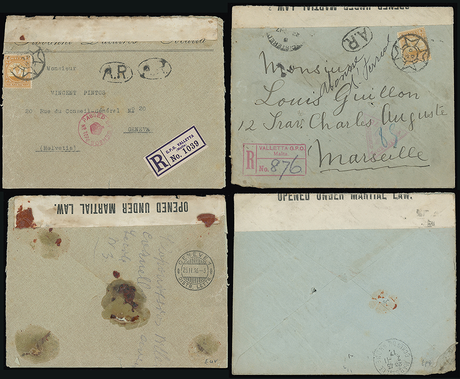 1364 c, entire, etc. imageMalta: Auxiliary Services: 1916, 1917, two censored envelopes to Geneva and Marseille respectively, both franked 41/2d. and showing oval “A.R.” mark, bearing registration label and handstamp respectively. (Image1)