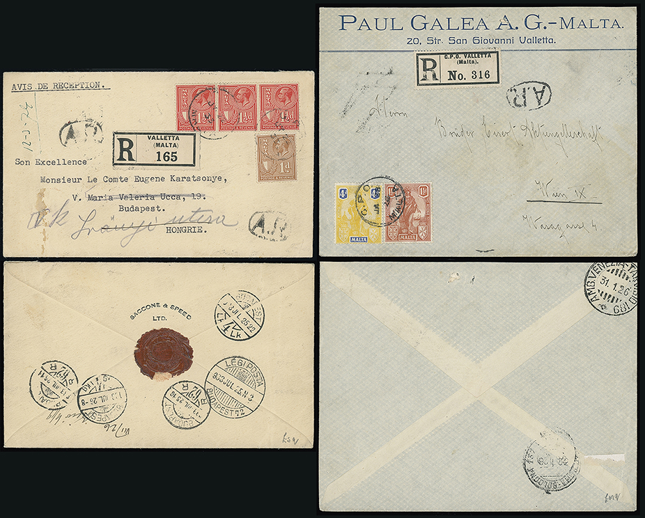 1369 c, entire, etc. imageMalta: Auxiliary Services: 1926 (Jan. 28) envelope to Vienna franked 11/2d. and 4d. and 1933 (July 22) envelope to Budapest both with Valletta registration labels and oval “A.R.” marks in black. (Image1)