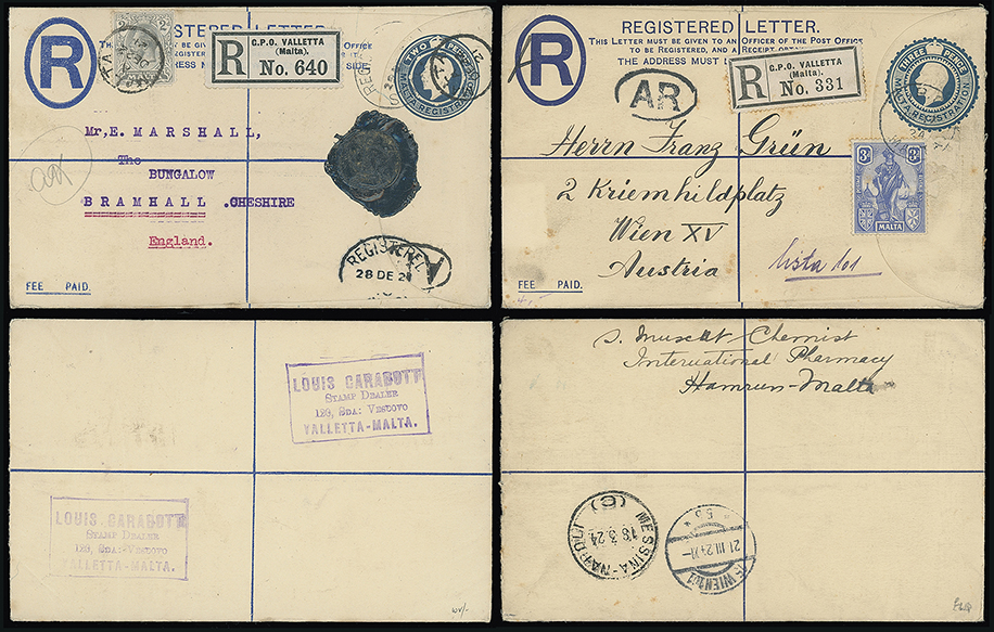 1365 c, entire, etc. imageMalta: Auxiliary Services: 1921 (Dec. 22) 2d. registration envelope to England franked 2d., 1924 (Mar. 17) 3d. registration envelope to Vienna franked 3d. both size G with Valletta registration label and oval “A.R.” mark in black. (Image1)