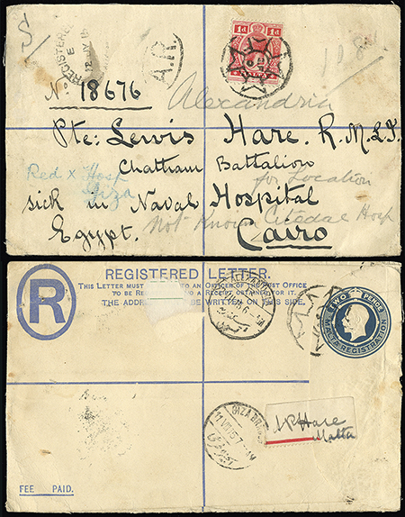 1363 c, entire, etc. imageMalta: Auxiliary Services: Oval “AR” marks, a selection incl. 1915 envelope to a private at a naval hospital in Cairo (redirected to Alexandria and Giza) franked 1d. with oval “REGISTERED/MALTA” datestamp, 1926 large envelope to Prague franked 21/2d. and 3d. blocks of four with Valletta registration label, 1929 envelope to Birmingham franked 41/2d. with Sliema registration label, 1937 envelope to New York franked 41/2d. with Valletta registration label etc. (12) (Image1)