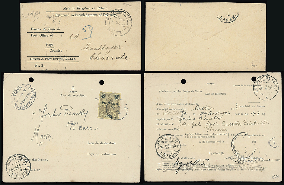 1368 c, entire, etc. imageMalta: Auxiliary Services: 1926 to 1930, selection of Advice of Receipt cards returned to Malta from with datestamps of Florence or Istanbul (2) on each and franked Malta 3d. also a 1910 official printed General Post Office Malta “Avis de Reception en Retour” envelope to France with Valletta c.d.s., very scarce. (4 items) (Image1)