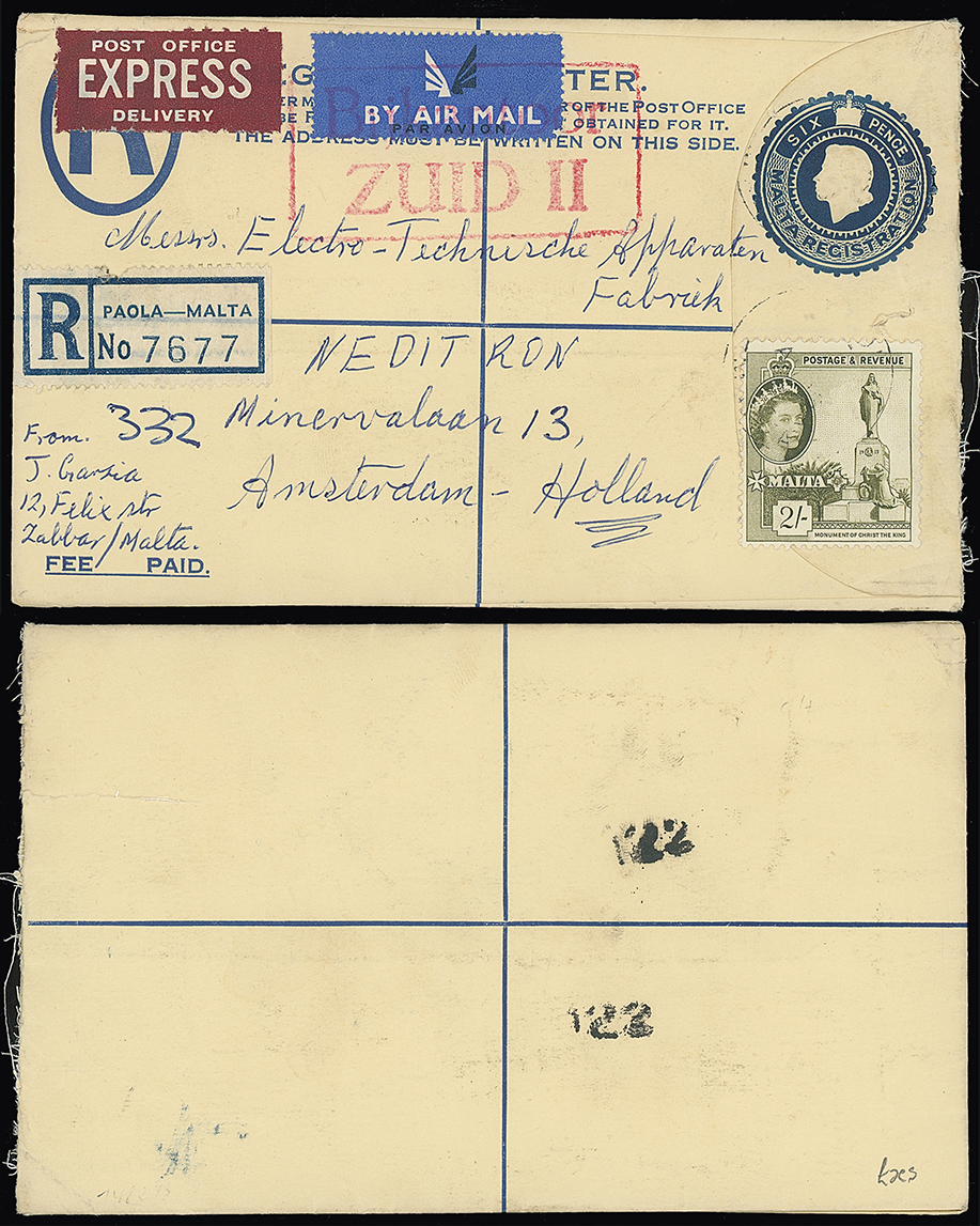 1370 c, entire, etc. imageMalta: Auxiliary Services: Express Mail, a selection incl. 1945 airmail envelope to Bristol with pink express label affixed and franked 2d. and 1s.6d. (2), 1953 envelope to Italy with pink “ESPRESSO” label affixed and franked 2d. pair and 1s., 1957 6d. registration envelope to Amsterdam franked 2s. with Paola, express and airmail labels etc. (19) (Image1)