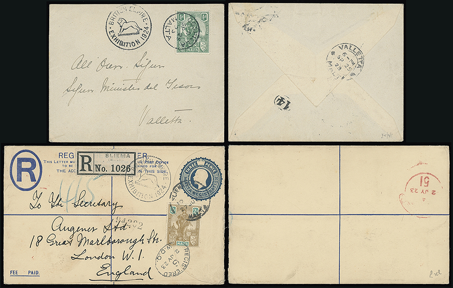 1366 c, entire, etc. imageMalta: Auxiliary Services: 1923 (June 27) 3d. registration envelope to London franked 2d. with Sliema registration label and 1923 (Sept. 25) envelope to Valletta franked 1/2d. tied by Cospicua c.d.s. both with circular promotional “BRITISH EMPIRE/EXHIBITION 1924” cachets in black and very scarce on Maltese mail, fine. (2 items) Photo. (Image1)