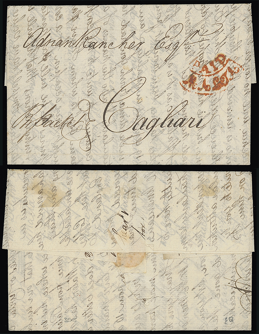 127 c, entire, etc. imageMalta: PAID MALTA Cursive Scroll Marks: 1809 (Sept. 18) entire letter “Br Packet” to Cagliari, Sardinia with red “PAID/MALTA” scroll mark, very fine and very rare. Photo. (Image1)