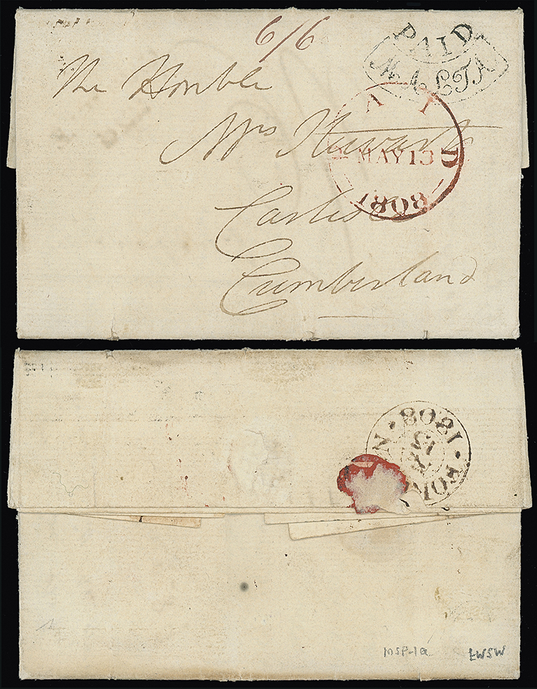 125 c, entire, etc. imageMalta: PAID MALTA Cursive Scroll Marks: 1808 (Apr. 6) entire letter to England (turned and sent to Port Patrick with a Carlisle mileage mark) black “PAID/MALTA” scroll mark (MSP-1a; early use) and red London Paid and Black Foreign on the reverse datestamps. Rated “6/6”(d) for the double packet rate. Photo. (Image1)