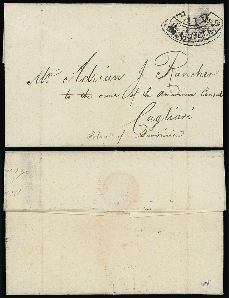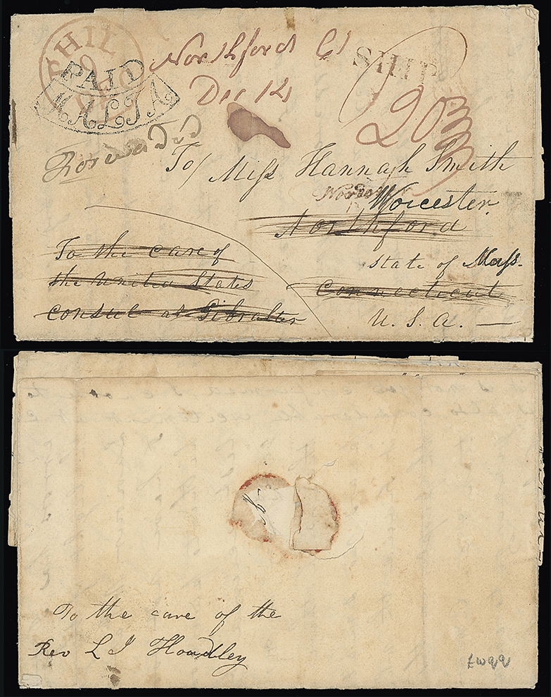 129 c, entire, etc. imageMalta: PAID MALTA Cursive Scroll Marks: 1826 (Sept. 22) entire letter to Connecticut, redirected to Massachusetts, endorsed “To the care of the United states consul at Gibraltar” with black scroll “PAID/MALTA” scroll mark (MSP-1b), “SHIP” mark, Philadelphia transit datestamp. The letter sent by noted missionary Rev. Eli Smith (1801-57) who prepared a translation of the Bible into Arabic to his sister, “A line of of packets, belonging to the British Government, sails regularly betweeen London, Gibraltar, Malta and Corfu....I send them (letters) to the U.S. Consul at Gibraltar who puts them on board vessels to America....”. Photo. Consul at Gibraltar who puts them on board vessels to America....”. Photo. (Image1)