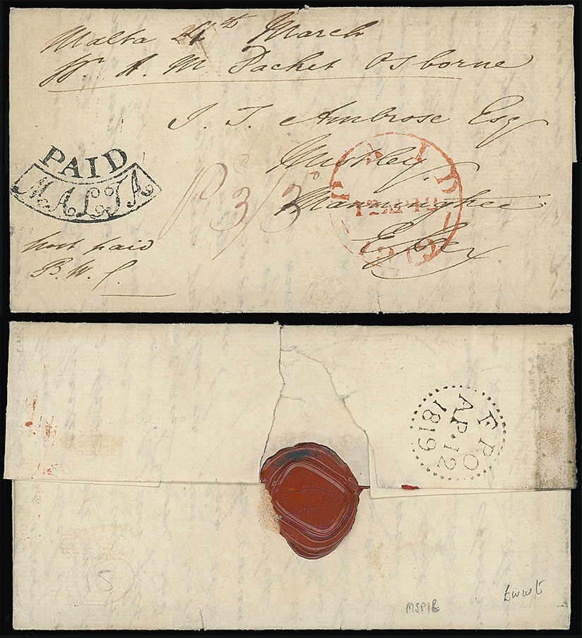 128 c, entire, etc. imageMalta: PAID MALTA Cursive Scroll Marks: 1819 (Mar. 4) entire letter “pr H.M.Packet Osborne” to England, datelined at Valletta and from an officer with black scroll “PAID/MALTA” scroll mark (MSP-1b) and London transit Paid c.d.s, rated “3/3”(d). Ex Ormer, Warren and Eastgate. Photo. (Image1)