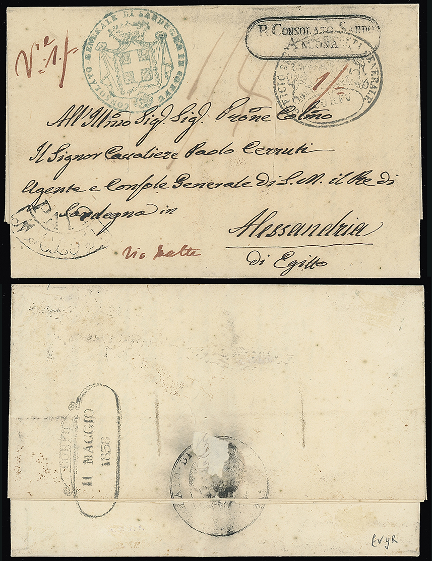 130 c, entire, etc. imageMalta: PAID MALTA Cursive Scroll Marks: 1838 (Apr. 22) disinfected slit entire letter to Alexandria “via Malta” with the oval the Sardinian Consul in Ancona cachet at top and posted in Corfu with Corfu oval Arms cachet and black “PAID/MALTA” scroll mark (MSP-1c) applied in transit. Rated “1/-” and “1/4”(d), with Corfu datestamp on the reverse, fine. Photo. (Image1)