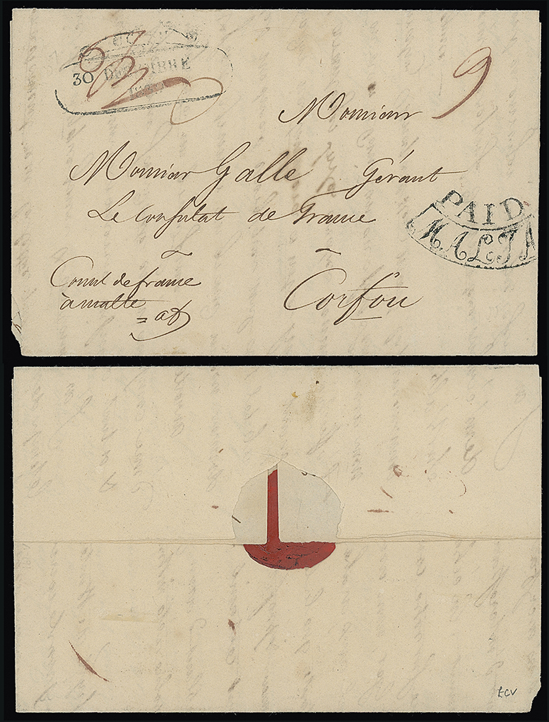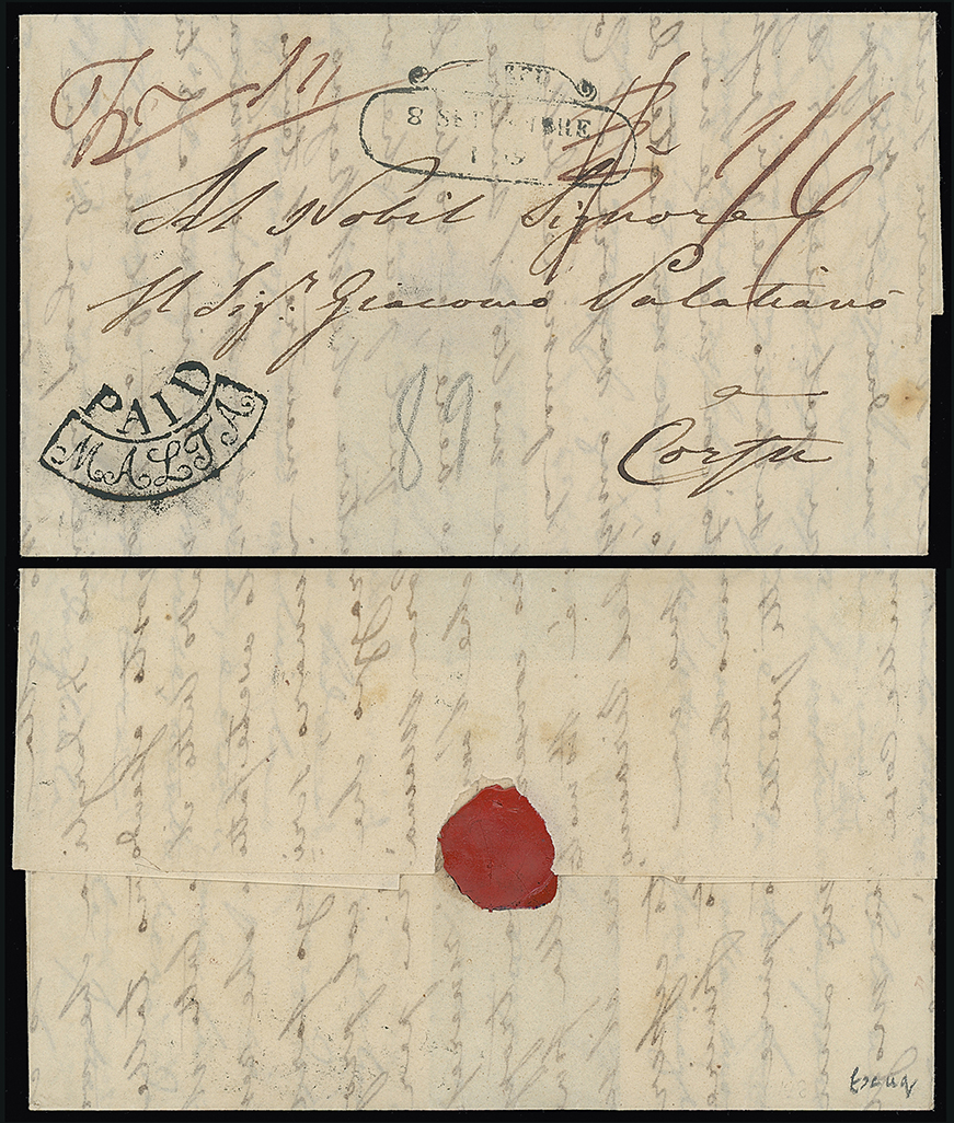 132 c, entire, etc. imageMalta: PAID MALTA Cursive Scroll Marks: 1839 (Dec. 27) entire letter to Corfu with very fine black “PAID/MALTA” scroll mark (MSP-1c) with oval Corfu arrival datestamp at top left and rated “9”(d). Carried on the Admiralty Packet HMS “Acheron”. Photo. (Image1)