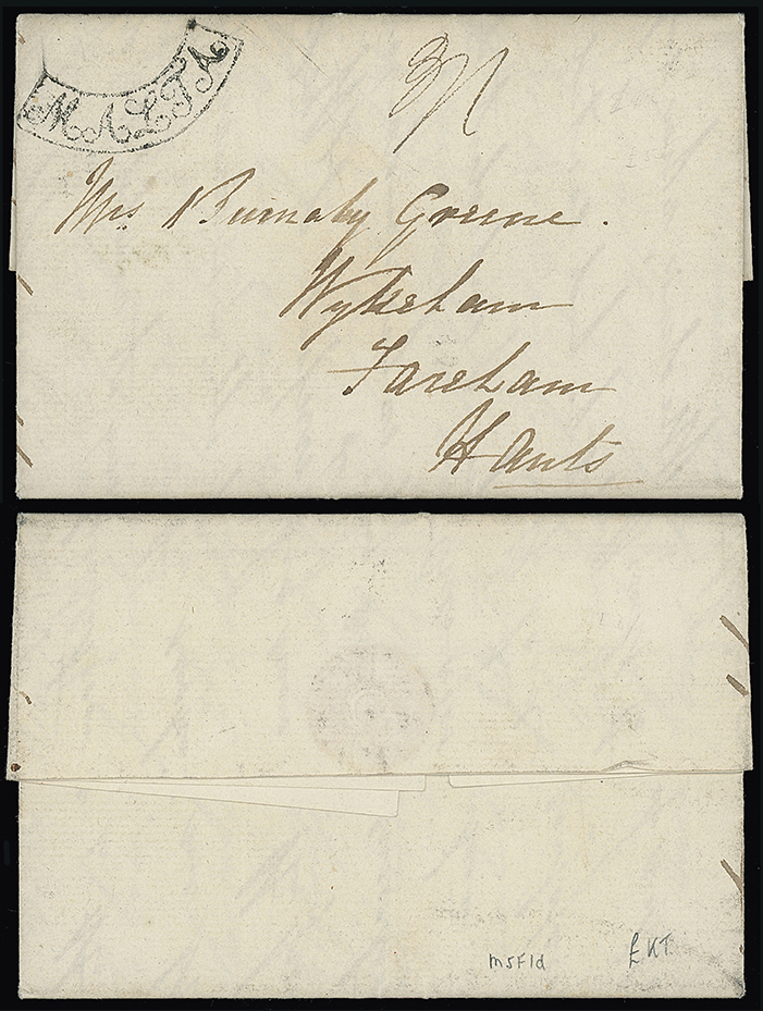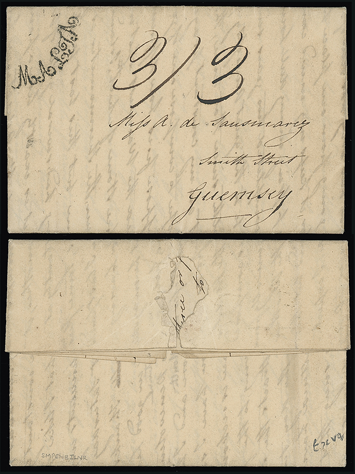 121 c, entire, etc. imageMalta: MALTA Cursive Scroll Marks: 1817 (Oct. 22) officers entire letter, written on HMS “Tagus” by Durell de Sausmarez to his sister in Guernsey with “MALTA” cursive scroll mark (MSF-1a; framelines entirely missing) in black and rated ‘3/3’(d) and carried on the “Princess Grace” from Malta to Falmouth. Photo. (Image1)