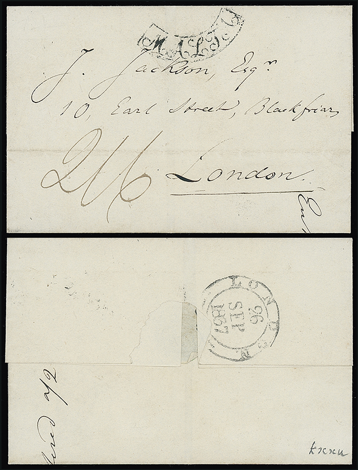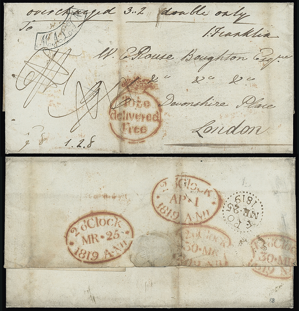 122 c, entire, etc. imageMalta: MALTA Cursive Scroll Marks: 1819 (Mar.) entire letter to London with “MALTA” cursive scroll mark (MSF-1a) endorsed “over charged 3.2 double only, I.Franklin” at top with “6/4”(d) deleted and re-rated ‘9/6’(d) also deleted and with “(crown)/To be/delivered/Free” mark. Carried on the “Countess of Chichester” from Malta to Falmouth., with five London datestamps on the reverse. Photo. (Image1)