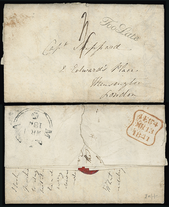 135 c, entire, etc. imageMalta: Circular Datestamps: 1841 (Mar. 1) entire to London with black “MALTA” Maltese Cross datestamp (MLC-2) and London arrival datestamp on the reverse. Rated “1/-” and with rare cursive “Too Late” mark applied in London. Carried by the “Great Liverpool” from Malta to Liverpool, mostly fine. Photo. (Image1)