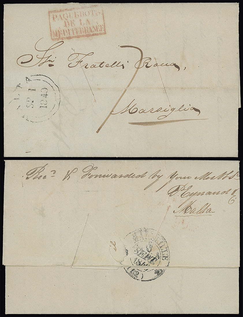 133 c, entire, etc. imageMalta: Circular Datestamps: 1840 (Aug. 27) disinfected slit entire letter to Marseille from Zante with P. Eynaud & Co. agents forwarding endorsement on the reverse and “MALTA” double arc (27mm) c.d.s. and framed “PAQUEBOTS/DE LA/MEDITERRANEE” mark in red, fine. Photo. (Image1)