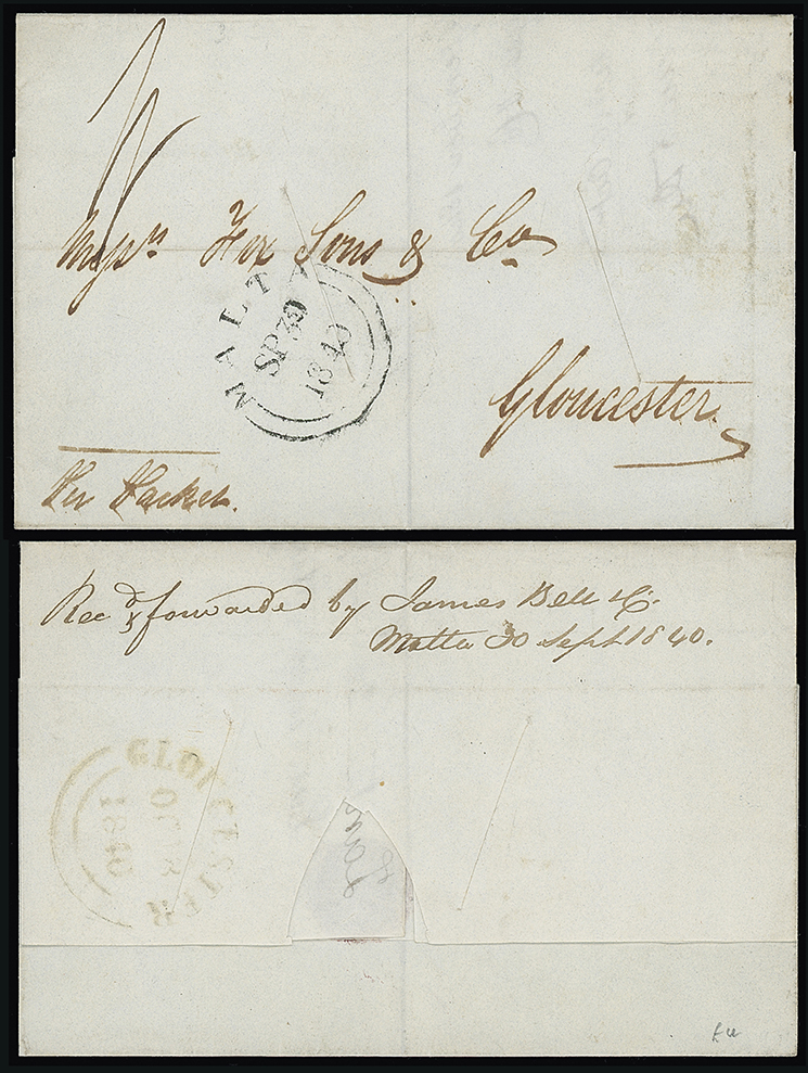 134 c, entire, etc. imageMalta: Circular Datestamps: 1840 (Sept. 25) disinfected slit entire wrapper “per Packet” to England from Zante with a James Bell & Co. agents forwarding endorsement on the reverse and “MALTA” double arc (27mm) c.d.s. and Gloucester arrival c.d.s., fine. Photo. (Image1)