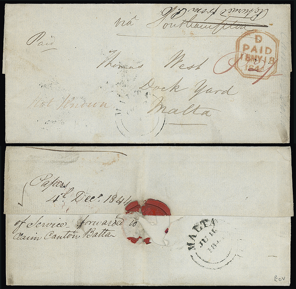 139 c, entire, etc. imageMalta: Circular Datestamps: 1844 (May 18) official entire letter “via Southampton” to Malta with London framed datestamp and “MALTA” (30mm) arrival double arc datestamp. Rated “2/-”, endorsed “Not Known” and “Returned from PO”. Photo. (Image1)