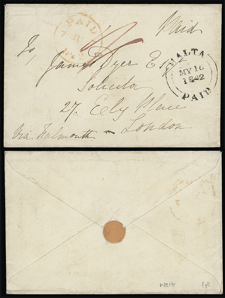 136 c, entire, etc. imageMalta: Circular Datestamps: 1842 (May 16) envelope “via Falmouth” to London with “MALTA/PAID” double arc (early use) and London Paid datestamps, rated “1/-” and carried by HMS “Alecto” via Gibraltar to Falmouth. Photo. (Image1)