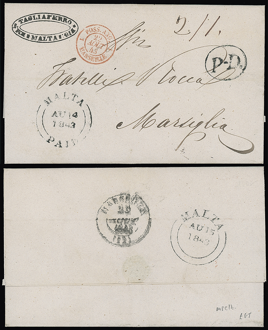 137 c, entire, etc. imageMalta: Circular Datestamps: 1843 (Aug. 14) wrapper to Marseille rated “2/1”(d) with “MALTA/PAID” and “MALTA” double arc datestamps in black (both 30mm), unusual thus, oval “P-D.”, “1 POSS.ANG.1/MARSEILLE” transit marks and Marseille arrival c.d.s. Ex Coates. Photo. (Image1)
