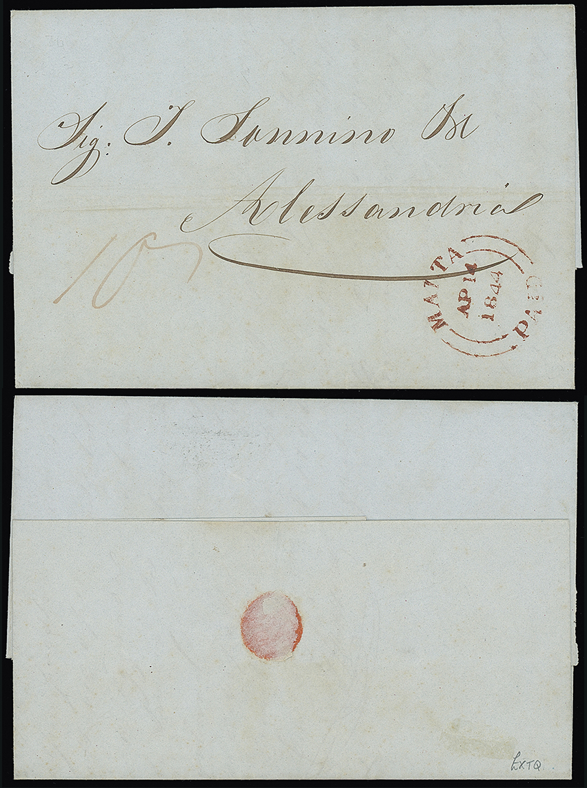 138 c, entire, etc. imageMalta: Circular Datestamps: 1844 (Apr. 14) entire letter to Alexandria rated “10”(d) with early use of “MALTA/PAID” (29mm; MPC-1a) in red. Photo. (Image1)