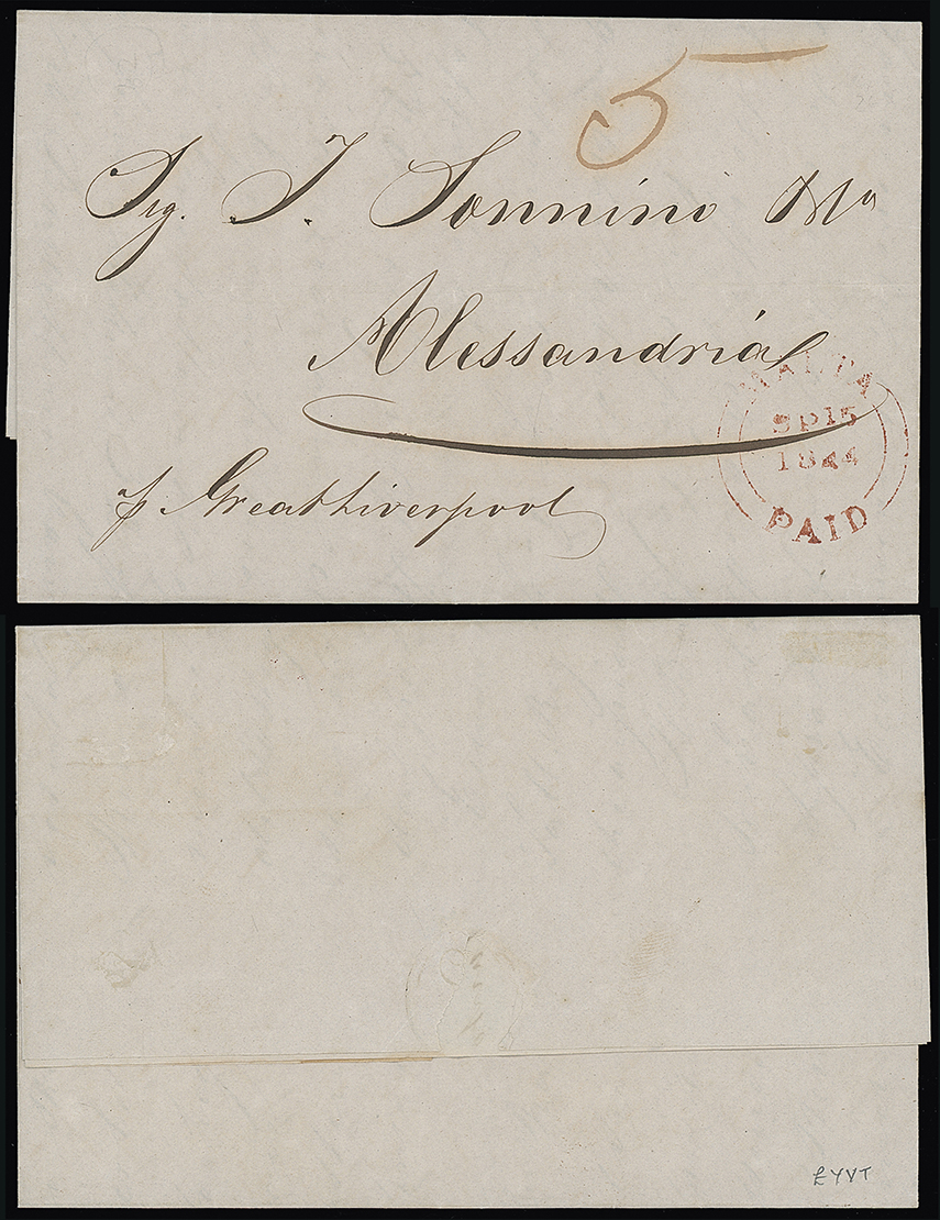 140 c, entire, etc. imageMalta: Circular Datestamps: 1844 (Sept. 15) entire letter “p Great Liverpool” to Alexandria rated “5”(d) with “MALTA/PAID” (29mm; MPC-1a) in red, fine. Photo. (Image1)