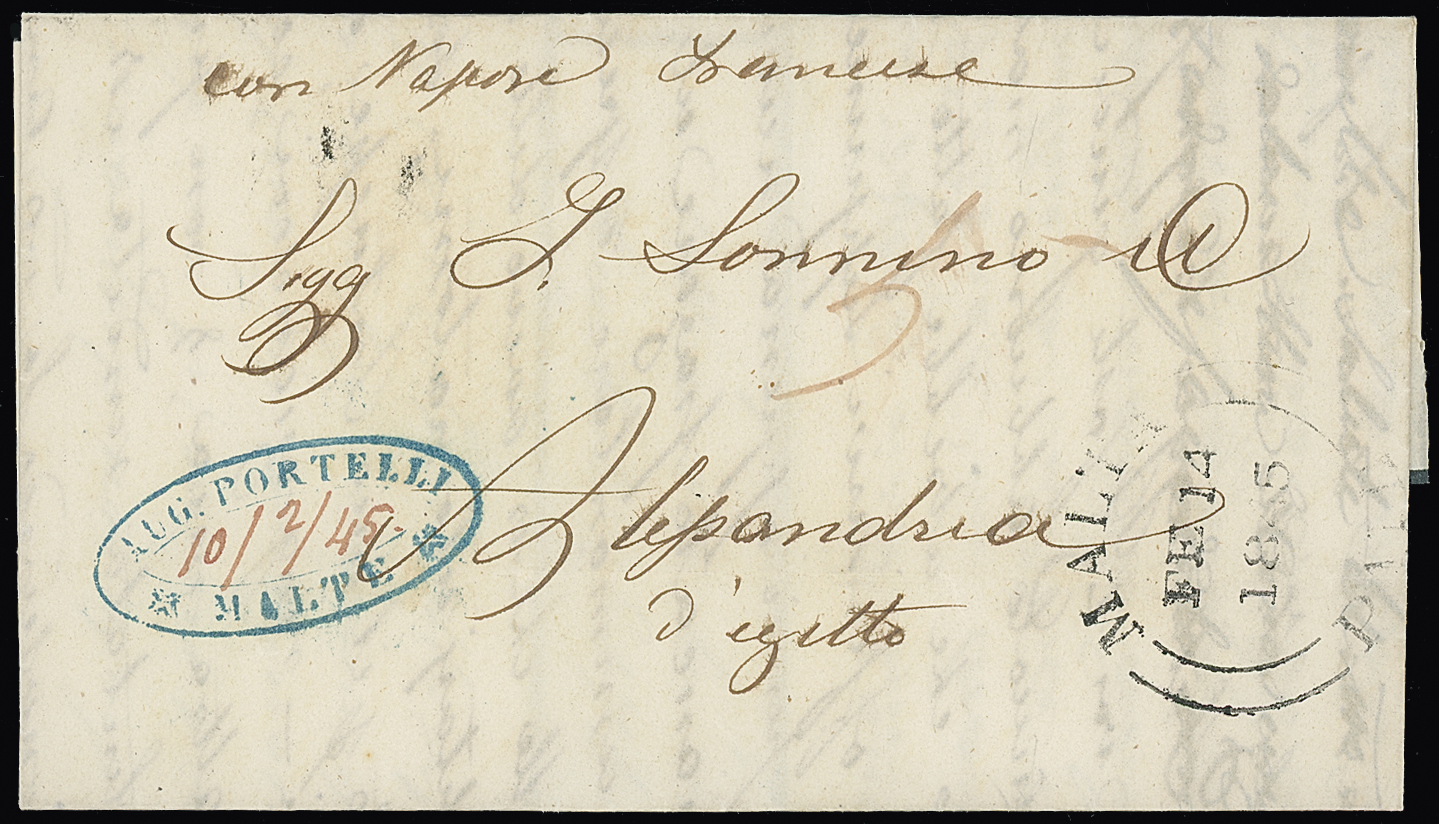 Malta: Forwarding Agents: 1845 (Feb. 3) entire letter “con Vapore Francese” to Alexandria, datelined at Livorno privately carried to Malta and with double ring oval forwarding agents cachet “AUG. PORTELLI/MALTE”