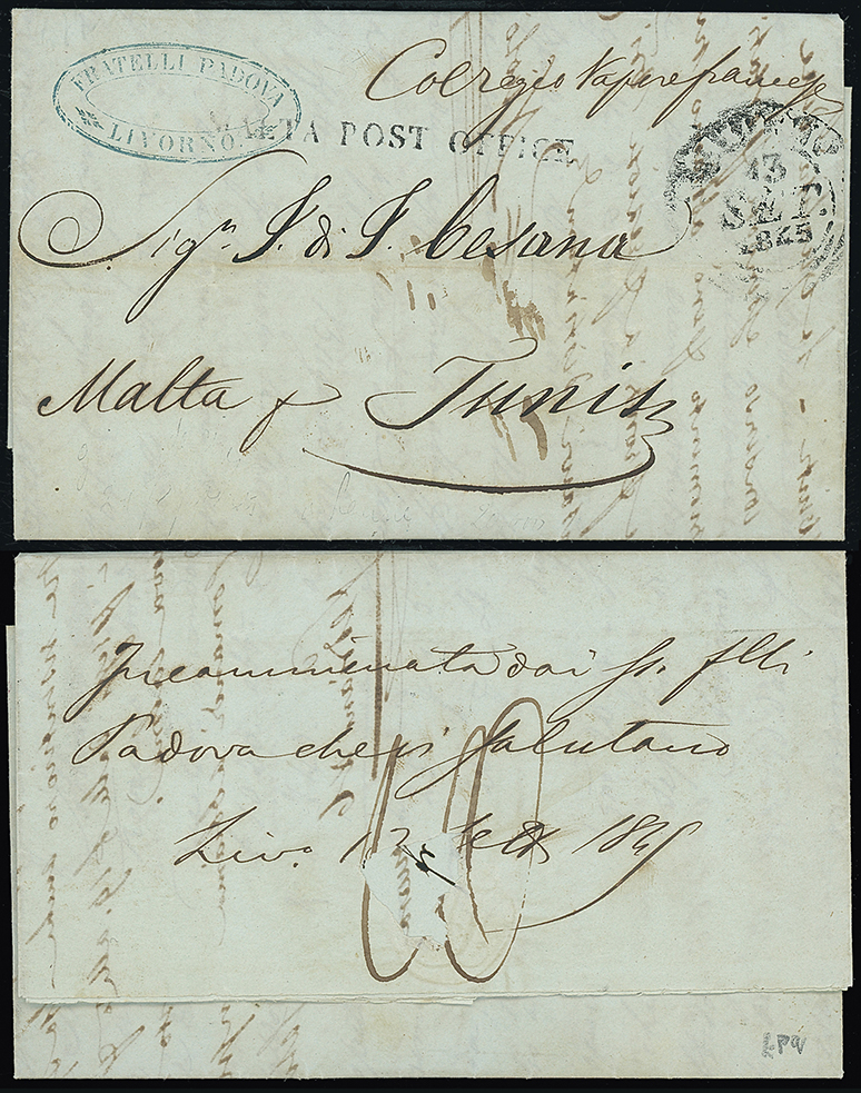 PADOVA/LIVORNO” and “MALTA POST OFFICE” mark and carried to Malta from Livorno on the French Ligne du Levant mailboat “Dante”, mainly fine. Photo.