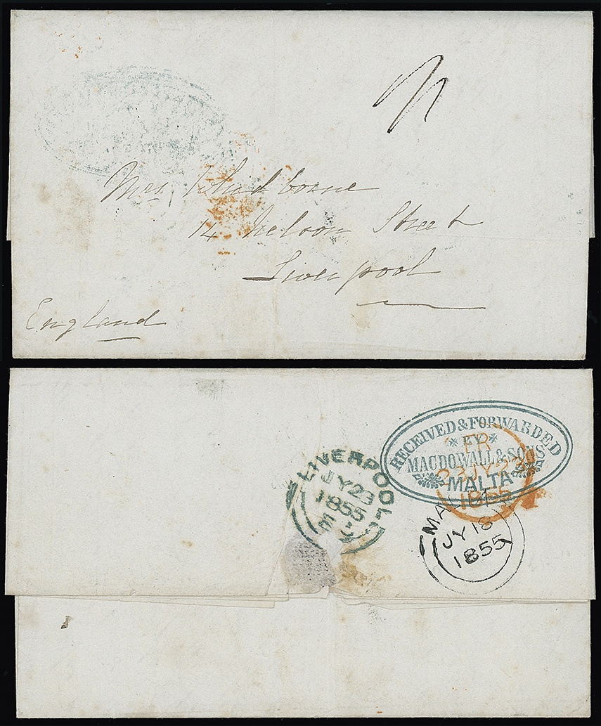 Malta: Forwarding Agents: 1855 (July 17) entire letter to Liverpool, apparently written in transit between Beccos Bay and Gibraltar. The reverse with double oval “RECEIVED & FORWARDED/BY/MACDOWALL & SONS/MALTA”