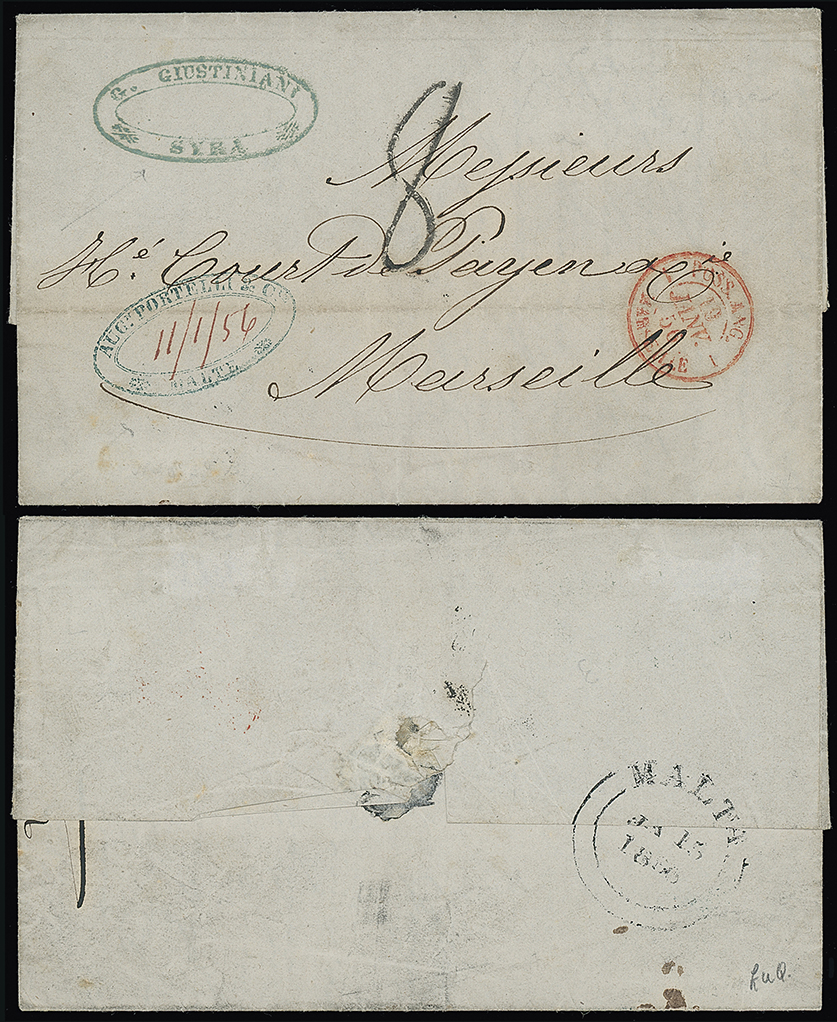 Malta: Forwarding Agents: 1855 (Dec. 22) entire letter datelined at La Canée, Crete to Marseille, with “G.GIUSTINIANI/SYRA” and “AUGN.PORTELLI & CIE/MALTA” forwarding agents’ cachets, Marseille arrival c.d.s. and