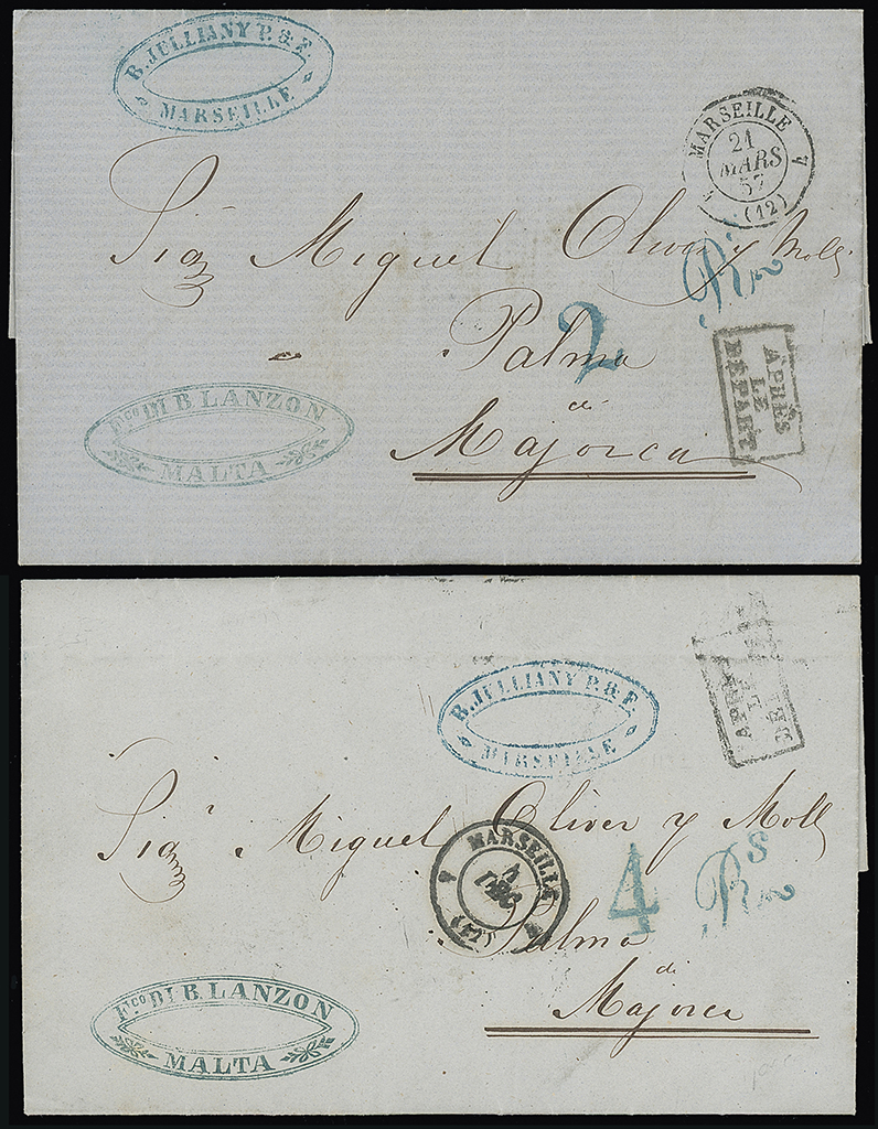 Malta: Forwarding Agents: 1856 (Nov. 26) and 1857 (Mar. 17) single and double weight entire letters to Majorca, apparently both sent within other posted covers, latter with an albino impression of a Malta