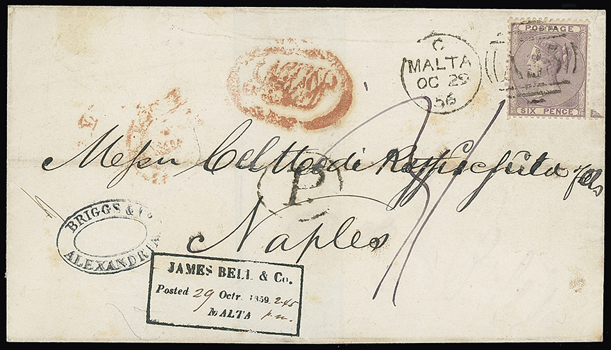 Malta: Forwarding Agents: 1859 (Oct. 22) wrapper to Naples with “BRIGGS & CO/ALEXANDRIA” forwarding agents’ cachet at left and sent privately to another forwarder with framed “JAMES BELL & Co/MALTA” datestamps