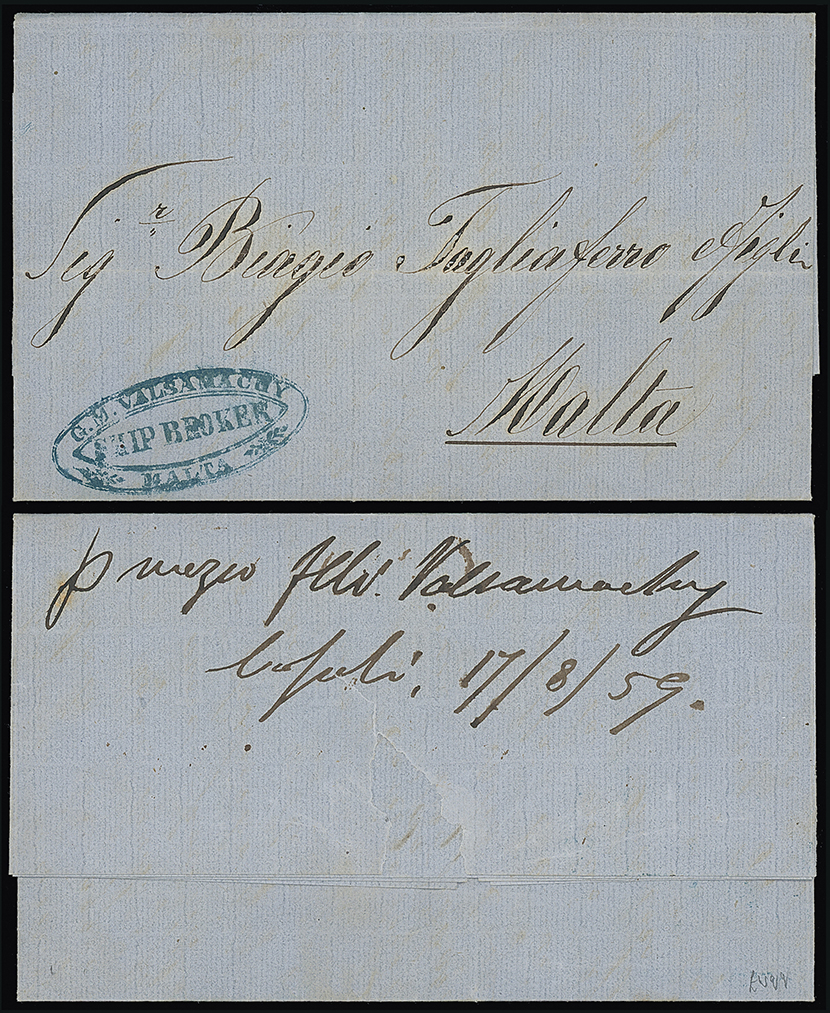 BROKERS/MALTA” forwarding agents’ cachets in blue-green and neither with postal markings. (2 items) (Image1)
