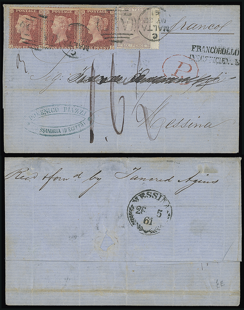 Malta: Forwarding Agents: 1861 (May 18) wrapper to Messina from Alexandria with manuscript “Recd & forwd by Tancred Agius & Co.” on the reverse and franked 1857 1d. rose-red strip of three and 1856 6d. tied by