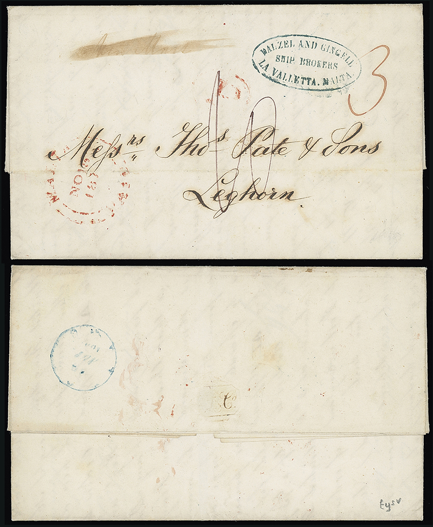 Malta: Forwarding Agents: 1857 (Nov. 6) entire letter to Livorno from Alexandria with oval “MALZEL AND GINGELL/SHIP BROKERS/LA VALLETTA MALTA” forwarding agents cachet in blue and rated “10” and “3” with Malta and