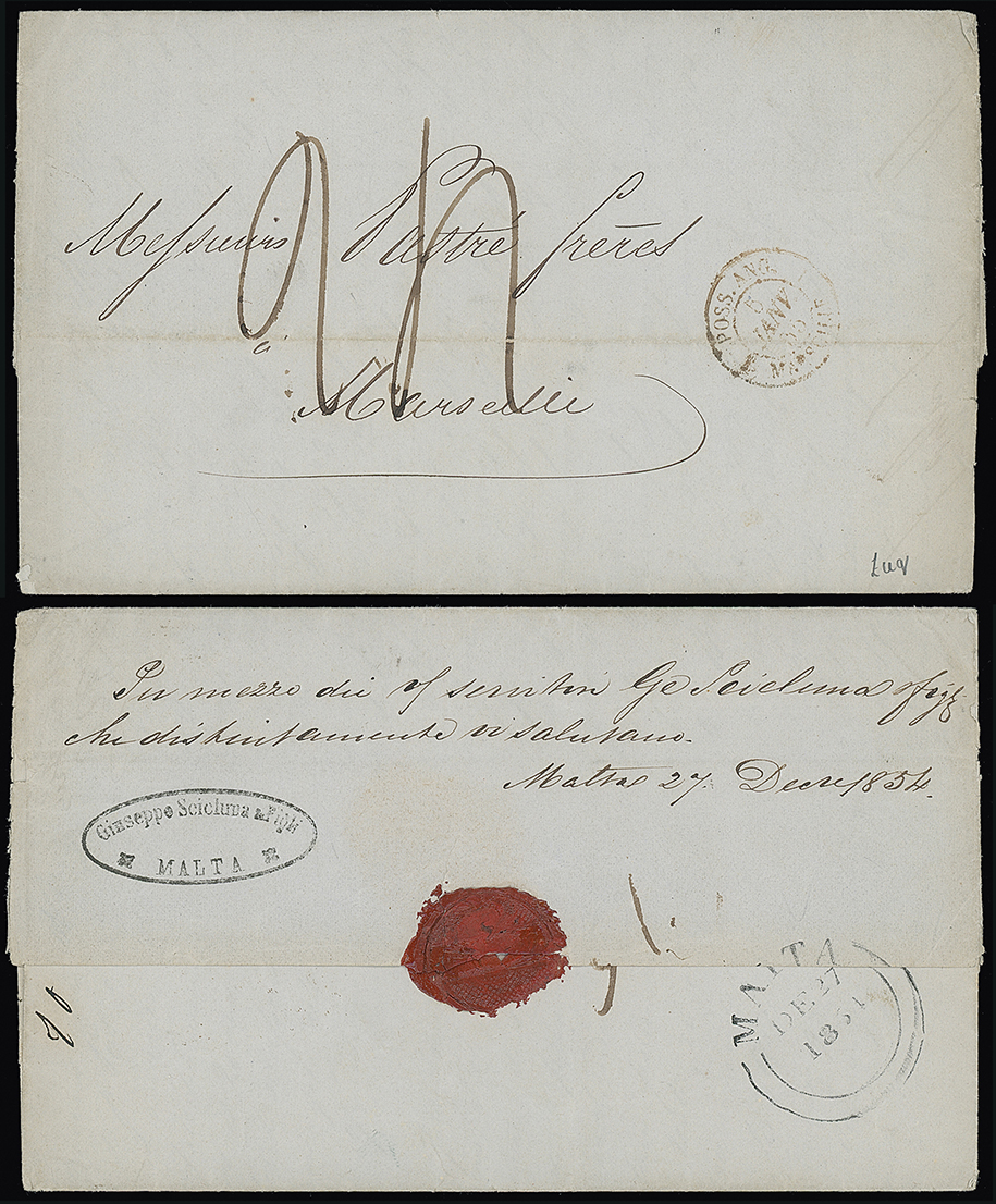Malta: Forwarding Agents: 1854 (Dec. 18) entire letter to Marseille from Alexandria with oval “Giuseppe Scicluna & Figli/MALTA” forwarding agents cachet and manuscript endorsement on the reverse, Malta and