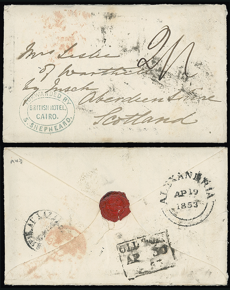 Malta: Forwarding Agents: 1853 (Apr. 11) envelope (with contents) to Scotland from Cairo with double ring oval “FORWARDED BY/BRITISH HOTEL/CAIRO./S.SHEPHEARD.” cachet, in blue-green, the only example recorded in