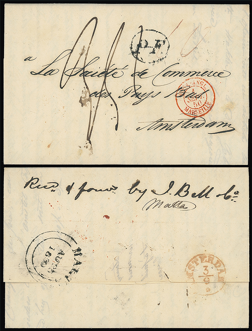 Malta: Forwarding Agents: 1850 (Aug. 22) entire letter to Amsterdam datelined at Smyrna carried privately to Malta and endorsed “Recd & Fwd by J.Bell & Co/Malta” on the reverse. Rated “10”(d) and with Malta,