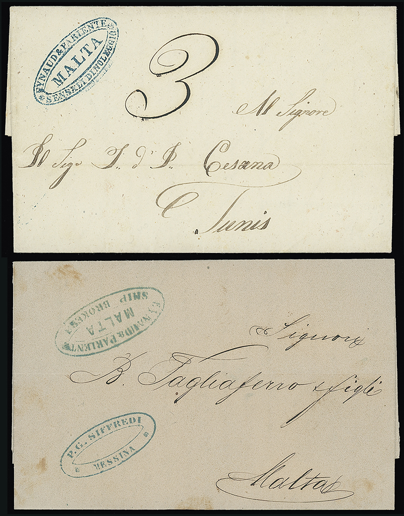 Malta: Forwarding Agents: 1847 (Sept. 9) entire letter to Tunis and 1863 (June 9) entire letter to Malta both from Italy and with oval “EYNAUD & PARIENTE/SENSELI DI NOLEGGIO” or “EYNAUD & PARIENTE/SHIP