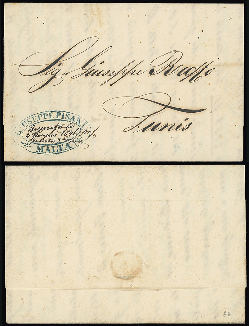 Malta: Forwarding Agents: 1846 (June 16) entire letter to Tunis from Civita Vecchia carried privately to Malta where “GIUSEPPE PISANI/MALTA” forwarding agent’s cachet applied in blue-green (signed and dated) and