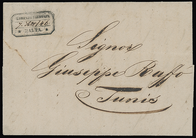 Malta: Forwarding Agents: 1846 (Sept. 2) entire letter to Tunis from Naples carried privately to Malta where framed “LORENZO FARRUGIA/MALTA” forwarding agent’s cachet applied in black (manuscript dated) and