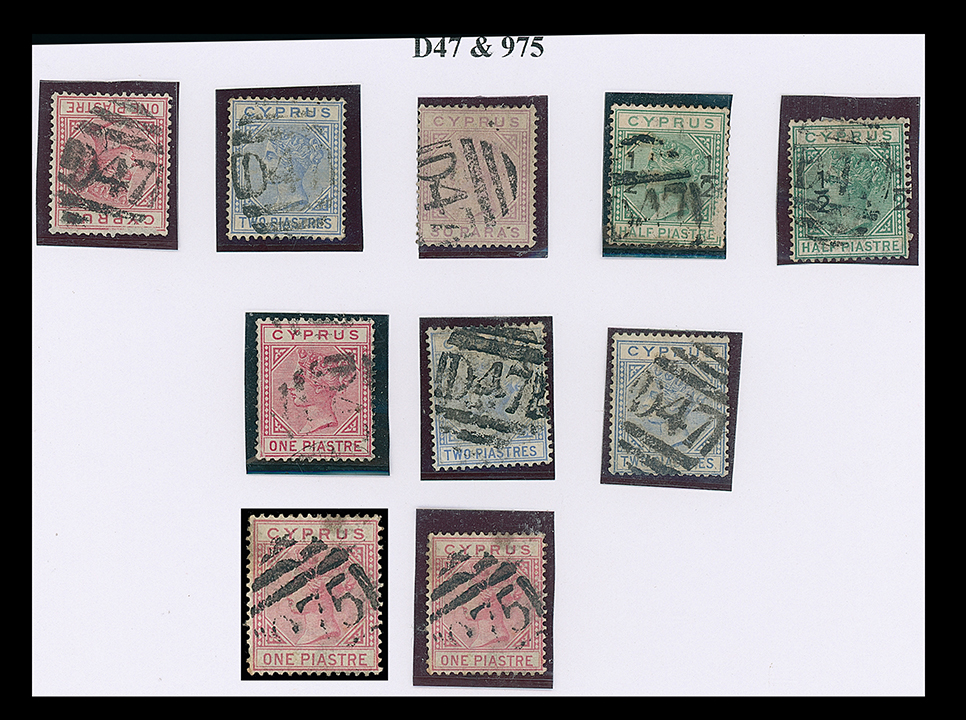 409 imageCyprus: Cancellations and Covers: A collection of cancellations written up on leaves on a range of Q.V. issues incl. “942” Lanarca, “969” Nicosia, “974” Kyrenenia, “982” Famagusta, “975” Limassol, “981” Papho, “D48” Head Quarter Camp, “098” Platres, “D47” Polymedia, also circular date stamps, etc. (204 items with some multiples) (Image1)