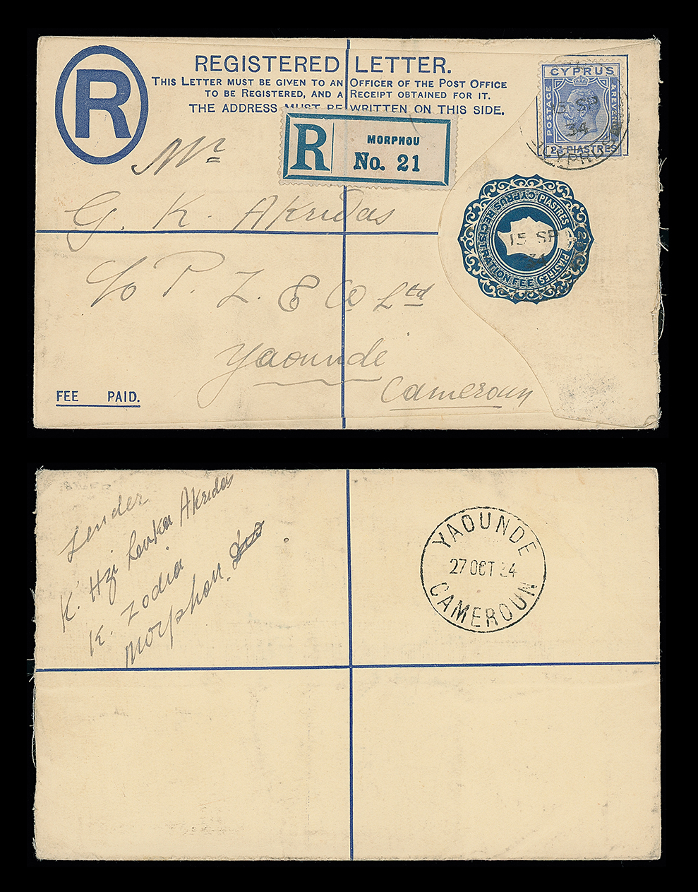 419 c, entire, etc. imageCyprus: Cancellations and Covers: 1934 (Sept. 15) K.G.V 21/2pi. registration envelope size G to Cameroun franked K.G.V 21/2pi. tied by Morphou c.d.s. and with Morphou registration label, the reverse with Yaounde (French Cameroun) arrival c.d.s., fine and unusual. Photo. (Image1)