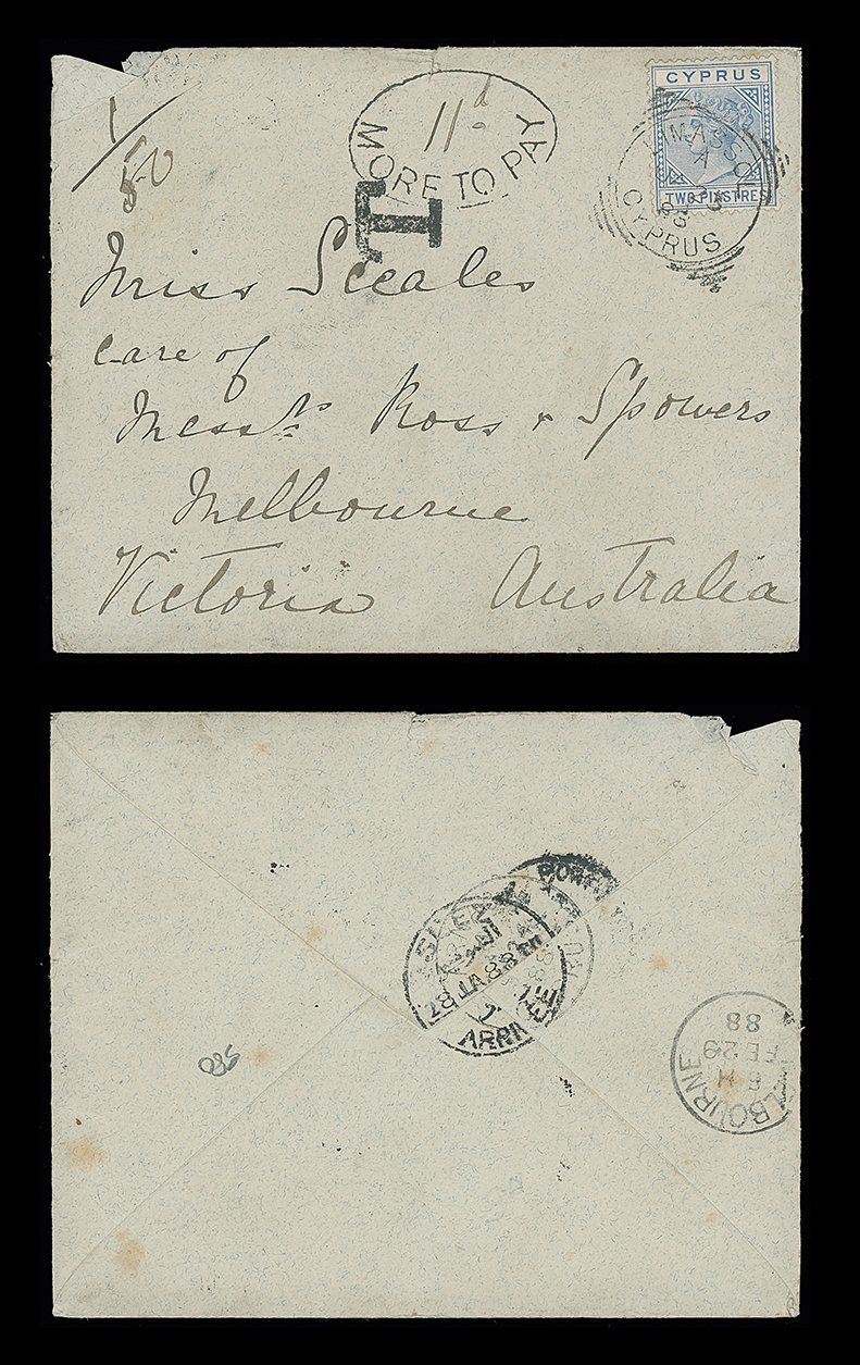 412 c, entire, etc. imageCyprus: Cancellations and Covers: 1888 (Jan. 23) envelope to Melbourne franked 2pi. tied by Larnaca squared circle datestamp, underpaid and with serif bold “T” mark applied and oval “11d’/MORE TO PAY” mark applied on arrival, the reverse with Suez and Melbourne c.d.s’s, the only example of mail to the Australian Colonies in the pre-U.P.U. period recorded by us. Photo. (Image1)