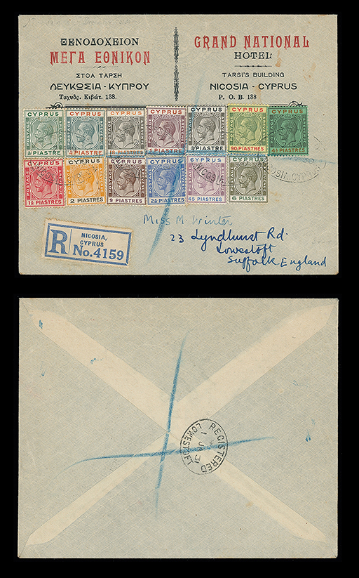 418 c, entire, etc. imageCyprus: Cancellations and Covers: 1930 (Dec. 22) Grand National Hotel envelope registered from Nicosia to England bearing 1924-28 values to 90pi. and 1925 values to 21/2pi. tied by registered ovals and blue pencil cross, with registration label and Lowestoft arrival backstamp. Photo. (Image1)