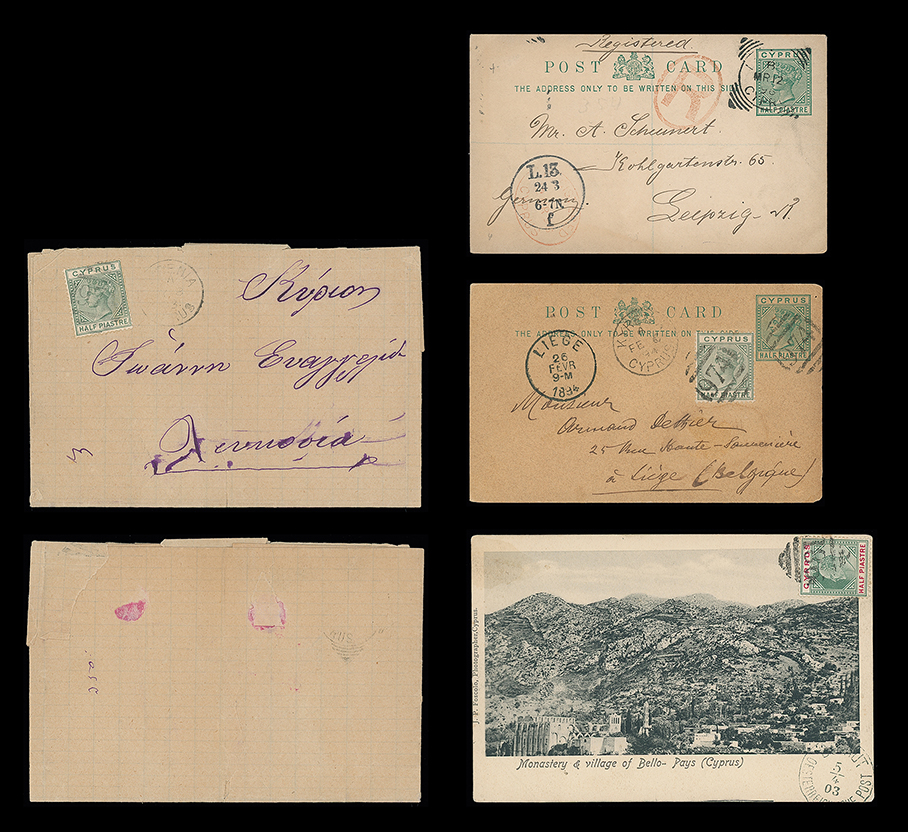 411 c, entire, etc. imageCyprus: Cancellations and Covers: Q.V. selection incl. 1883 (May 12) wrapper to Famagusta franked 1/2pi. tied by “974” barred oval and with “KYRENIA” (code “A”) c.d.s. alongside, 1894 1/2pi. postcard to Leige uprated 1/2pi. tied by Limassol barred oval “974” cancellation, 1896 (Mar. 12) 1/2pi. postcard to Leipzig with uprated stamp missing and oval “R” mark, 1903 picture postcard franked 1/2pi. tied by “981” (Paphos) barred cancellation with Austrian P.O. in Beyrout arrival c.d.s. (4) Photo. (Image1)