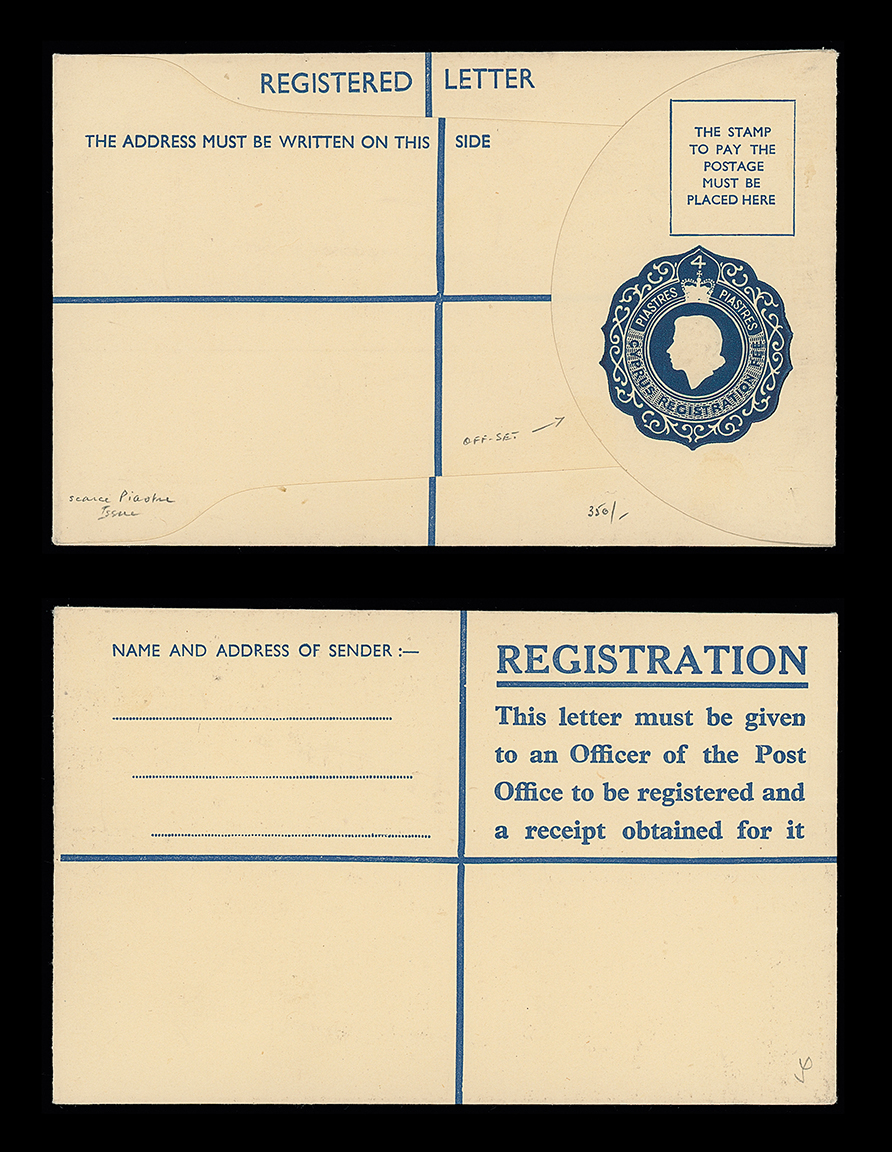 407 c, entire, etc. imageCyprus: Postal Stationery: Registration Envelopes: 1953 4pi. registration envelope size F, unused with distinct offset of the indicia on the rear flap, unusual. Photo. (Image1)