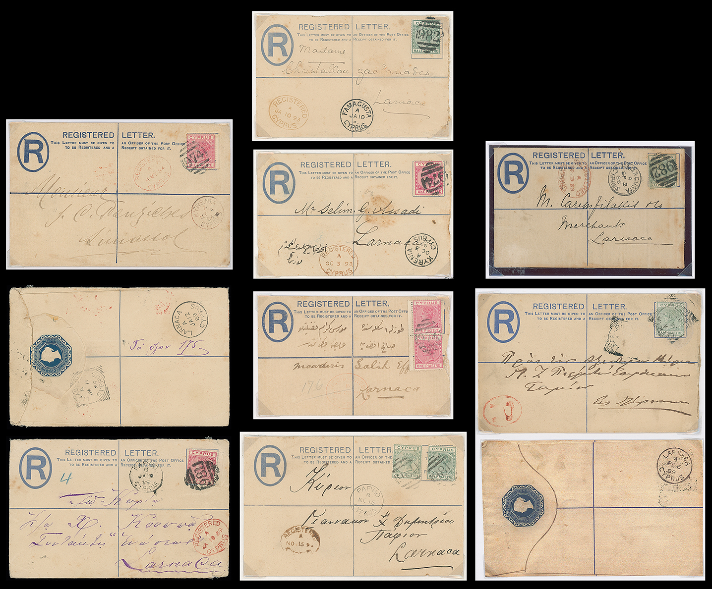 406 c, entire, etc. imageCyprus: Postal Stationery: Registration Envelopes: Q.V. 2pi. registration envelope used selection incl. 1884 2pi. size G to Limassol franked 1pi. tied by “974” barred oval with Kyrenia c.d.s. below, 1888 (Sept. 3) to Larnaca franked 1/2pi. tied by “982” barred oval with Famagusta and registered oval datestamps, 1889 2pi. to Larnaca franked 1pi. tied by “981” (Paphos) barred oval etc. (9) (Image1)