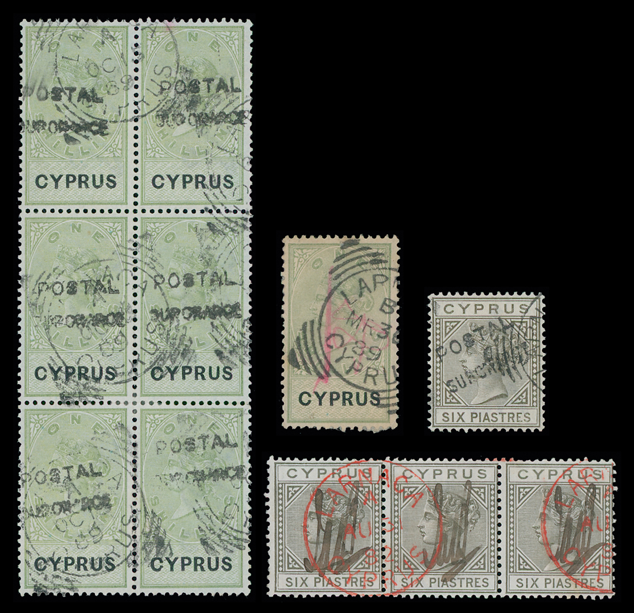 405 imageCyprus: Usage for Accounting: Collection in a F.G. Popular boxed album with many scarcer items, all ‘used’, incl. range initialled “JAB” (J.A. Bulmer, Head Postmaster) with values to 6pi. strip of three, 30pa. on 1pi. multiples incl. blocks of four (2), strip of five and block of six showing surcharge types, revenue stamp values to 2pi. (2), additional “POSTAL/SURCHARGE” handstamps with 30pa. on 1pi. (11, incl. block of eight), 6pi., revenue 1pi. (2), “POSTAL/SURCHARGE” handstamp only on values to 6pi. (4) and revenue values to 6pi. and 10s. with 1s. block of six, and 1s. apparently initialled “BJK”, poor to fine. (80) Photo. (Image1)