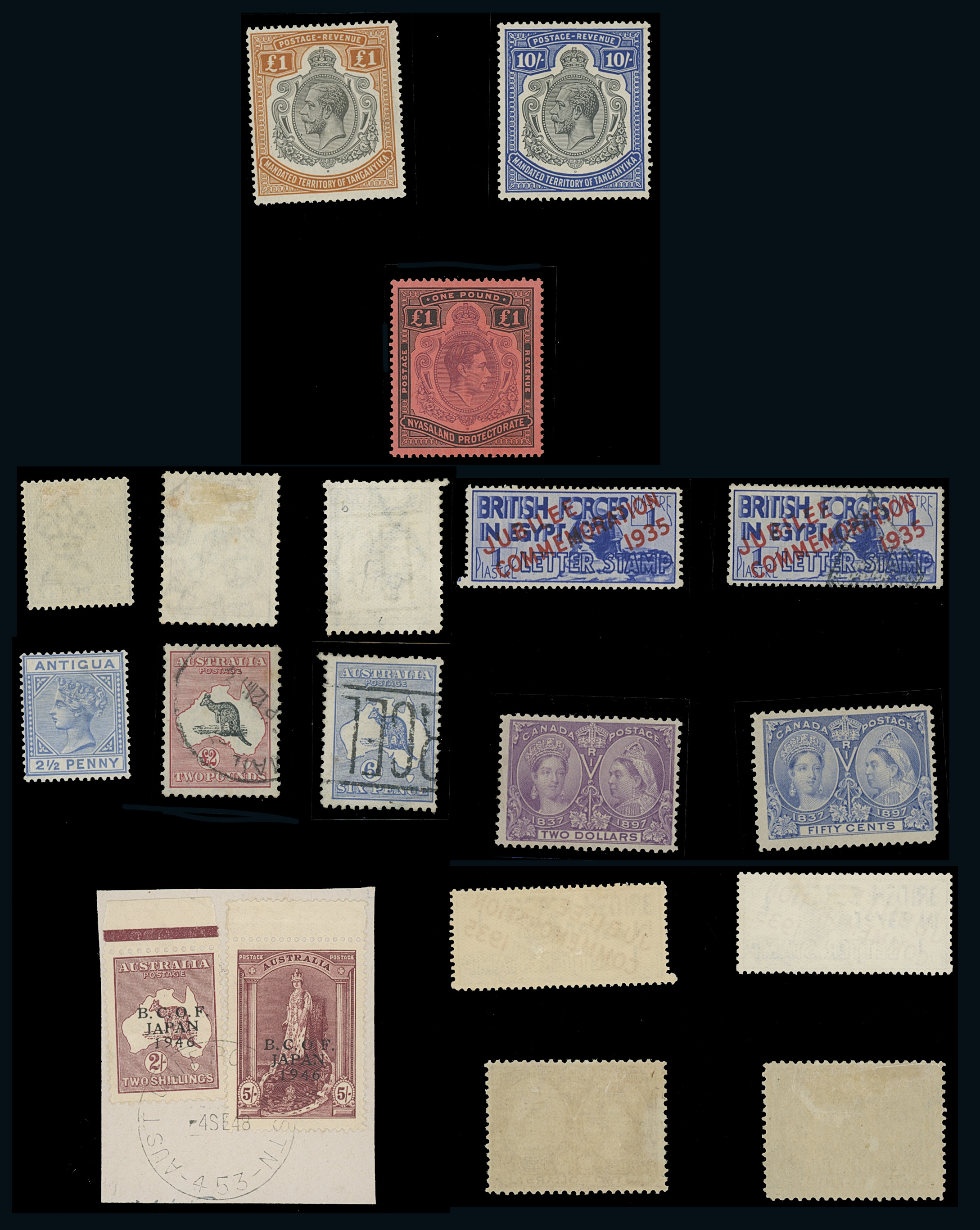 1929-30 £2 (corner repair) and 1931-36 £2, Bahamas 1859-60 1d., Barbados 1860 pin-perf. 121/2 1/2d. (certificate), Bechuanaland 1888 £5 (cleaned, fake cancellation), Bermuda 1874 3d. on 1s., British Guiana 1862 1c. typeset, Natal 1869 1s., New