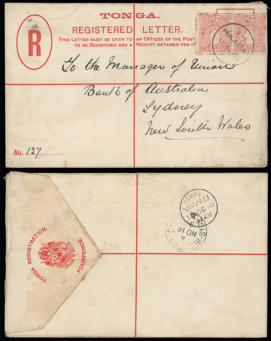 2055 c, entire, etc. imageThe James Teron Collection of Tonga: Postal Stationery: Registered Envelopes: 1895 (Oct. 14) 4d. envelope, 1893 (Jan.) size G, used to Sydney bearing 1895 21/2d. rose air, tied by Haapai c.d.s., with Vavau and Sydney transit and receiving marks on the reverse. H&G 6. Photo. (Image1)