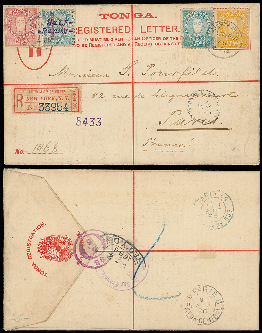 2056 c, entire, etc. imageThe James Teron Collection of Tonga: Postal Stationery: Registered Envelopes: 1896 (Aug. 3) 4d. 1892 size G, used to Paris, uprated by 1895 21/2d. 5d. and 71/2d. also 1896 (May) overprint reading down 1/2d. on 71/2d. on 2d., tied by Nukualofa c.d.s’s, with San Francisco, New York and Paris transit and receiving marks on the reverse. H&G. 4. Photo. (Image1)